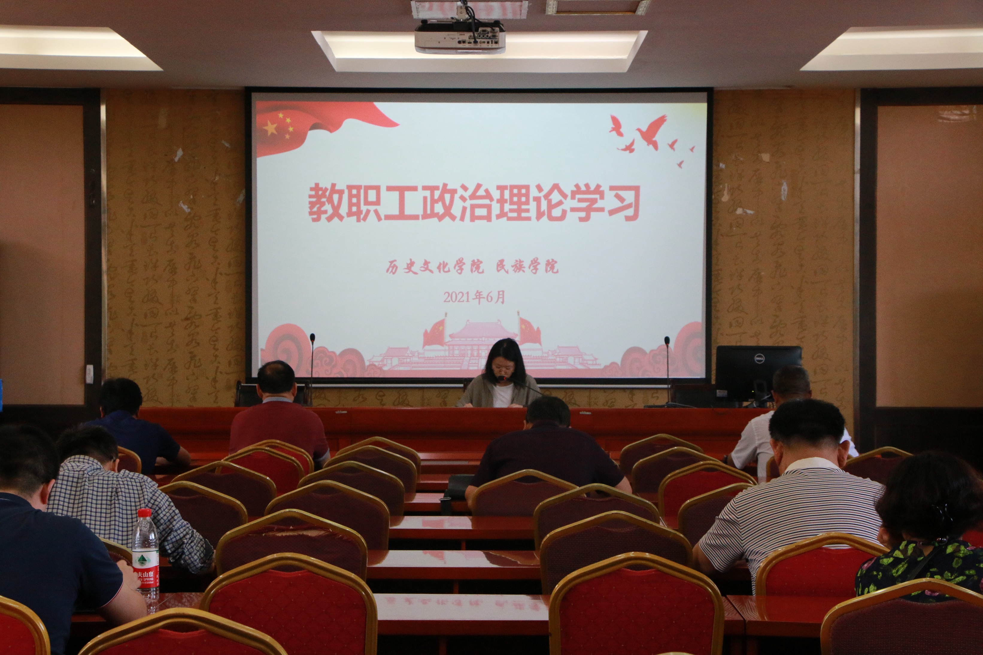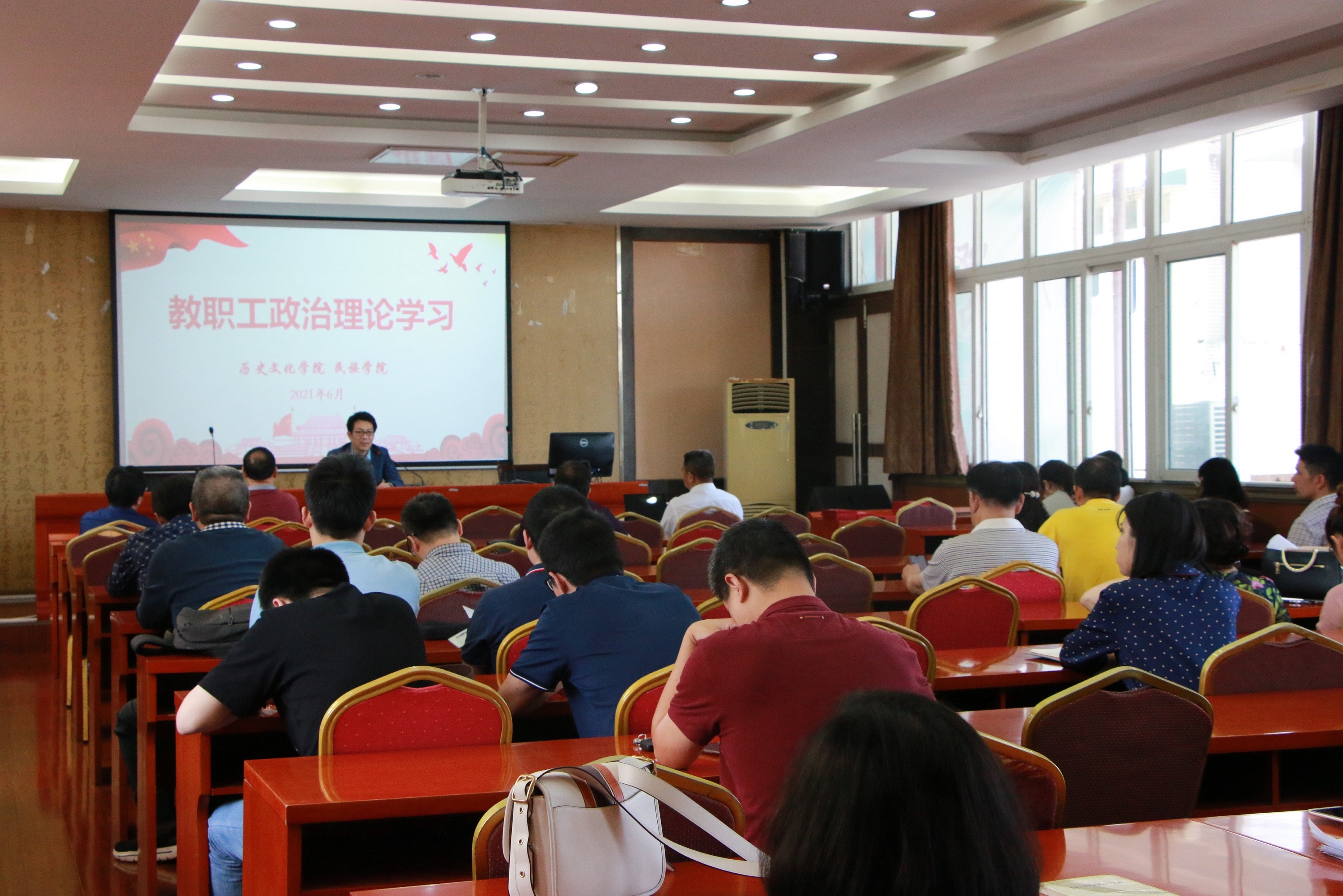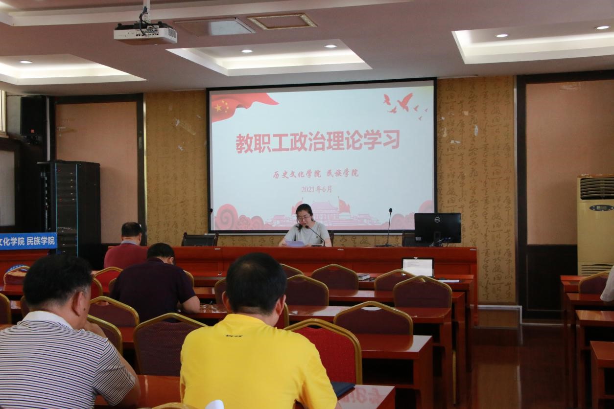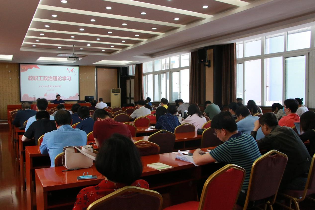 2021年6月4日下午,历史文化公司党委组织全院教职工在荟文楼7楼报告厅进行2021年第六次政治理论学习。此次大会的主要内容是传达公司近期工作会议精神,汇报公司目前主要工作开展情况,并开展政治理论学习。会议由公司党委书记罗庆昌主持。