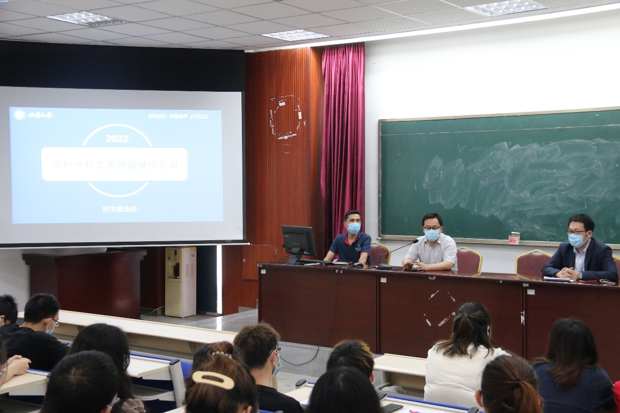 陈玖豪老师接着从招生计划的珍贵性、招生工作的政策性、招生计划执行的严肃性三个招生工作的性质上,向同学们阐明了升科考试及专业填报的重要意义。随后,就本次升科考试的“专业志愿清”录取原则和志愿填报系统的操作流程,陈玖豪进行了详尽的讲解与培训。