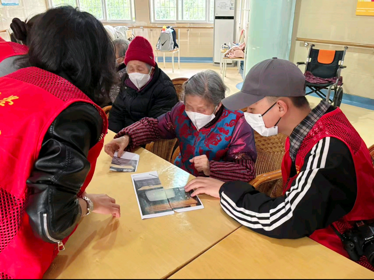 手工环节中,团支部特别准备了以“老物件”为主题的拼图。老人们一边拼凑缝纫机、搪瓷杯、自行车等怀旧图案,一边向围坐身旁的同学们讲述自己与这些物件的青春故事。82岁的李奶奶抚摸着拼图上的黑白电视机感慨:“这是当年家里最贵的‘三大件’,每晚邻居都挤着来看节目……”老人们的讲述让同学们感受到时代变迁中平凡生活的珍贵记忆。活动意外延伸至老人居室,86岁的胡爷爷主动邀请同学参观他的房间,展示自己的结婚周年纪念照、书画作品。