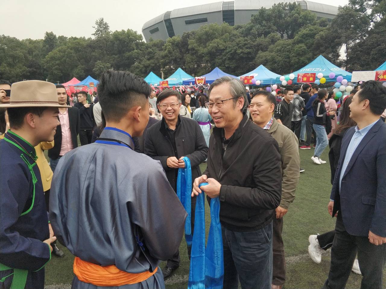 11月15日下午两点半,民族文化游园会准时在第三运动场举行,维吾尔族姑娘带来的开场舞《心上人》撩人心弦,迅速点燃了到场师生们的活力与热情。游园会开始后不久,安春元副书记来到游园会现场,仔细参观各个少数民族展台,了解不同民族文化与风俗,并与少数民族同学们进行亲切交流。到场的师生们也积极参与各民族的特色活动,品尝民族特色美食,体验民族活动。游园会现场热闹非凡,民族氛围十分浓厚。