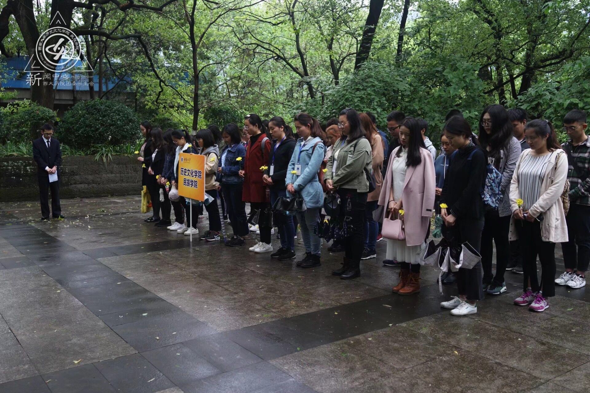 接下来,博讲左超名同学诵读悼词,肃穆不失雄壮之情的悼词,引起了在场所有人的情感共鸣。默哀三分钟后,同学们依次上前鞠躬献花,向先烈表示自己的崇高敬意。