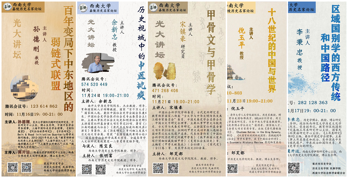 自11月4日以来,公司举办9场大型学术讲座,邀请到中国社会科公司、清华大学、复旦大学、南开大学、四川大学、华东师范大学、陕西师范大学等单位的学部委员、国家级人才及学术名家齐聚杏林、纵论古今。讲座内容涵盖了甲骨文与甲骨学、区域国别学、十八世纪的中国与世界、中医抗疫、中东问题、长城与边防、历史教育等诸多领域,彰显了公司“博雅会通”的治学风貌和立德树人的办学理念。