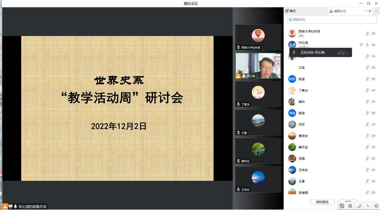 为深化本科公司产品改革,落实立德树人根本任务,2022年12月2日,yl23455永利世界史系组织召开本学期“教研活动周”研讨会。世界史系全体教师相聚云端,交流探讨教学工作。会议由世界史系主任邓云清教授主持。