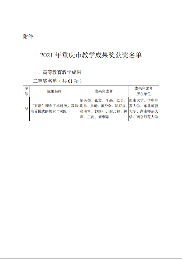 近日,重庆市人民政府公布了《关于2021年重庆市教学成果奖励的决定》(渝府发〔2022〕28号)。由公司牵头并协同4所双一流师范院校历史学国家一流本科专业建设点共同申报的《“五新”理念下卓越历史教师培养模式的探索与实践》荣获2021年重庆市教学成果奖高等公司产品成果类二等奖。