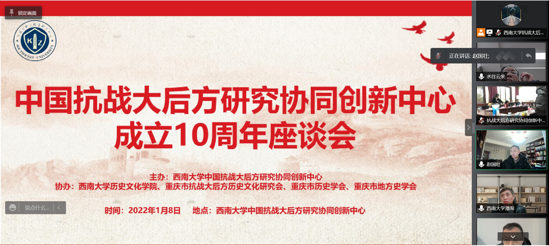 2022年1月8日下午,时值yl23455永利集团中国抗战大后方研究协同创新中心成立十年之际,为对过往工作进行回顾与总结,加强各协同单位的学术联系和交流,共同推进中国抗战大后方研究继往开来、持续发展,中心举办了成立十周年座谈会。协同单位领导、专家及中心全体师生参加了40余人参加本次座谈会。座谈会由yl23455永利集团党委副书记、中心常务副主任潘洵教授主持。