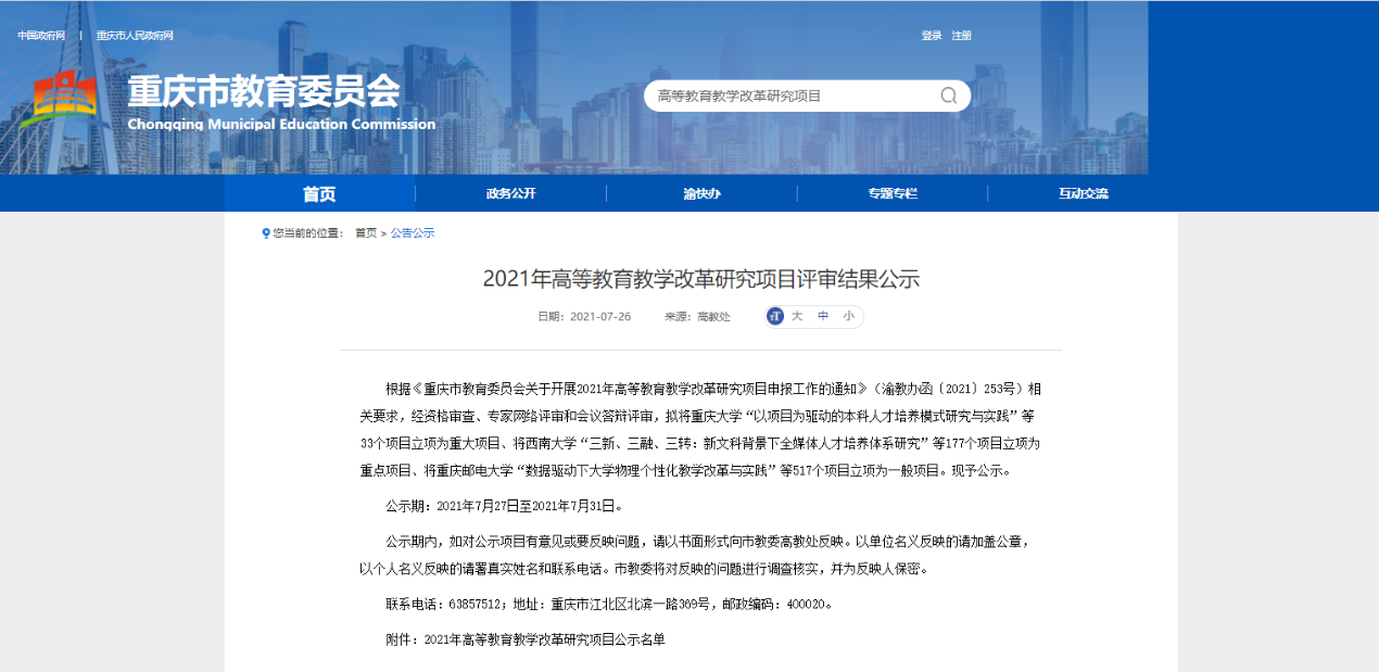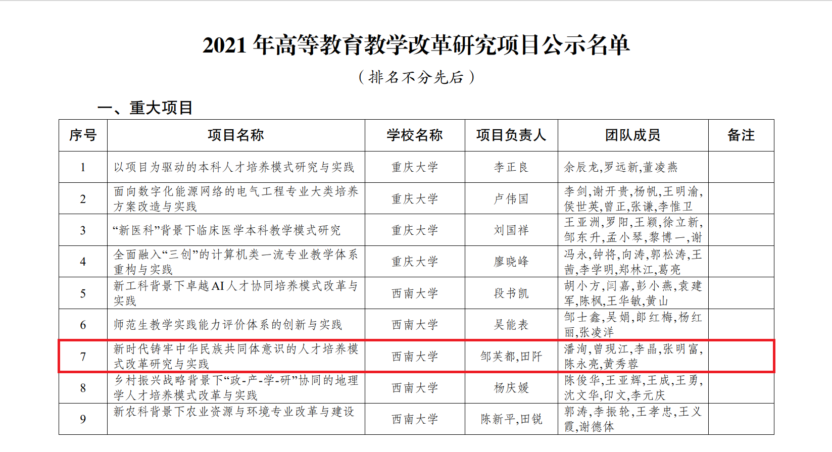 日前,重庆市教育委员会公布重庆市高等公司产品改革研究项目立项名单,公司邹芙都、田阡教授领衔申报的重大项目《新时代铸牢中华民族共同体意识的人才培养模式改革研究与实践》成功获得立项,项目团队成员为公司教师潘洵、曾现江、李晶、张明富、陈永亮、黄秀蓉等。此次全市高校共有33项获重大项目立项,其中yl23455永利集团获5项居于首位。