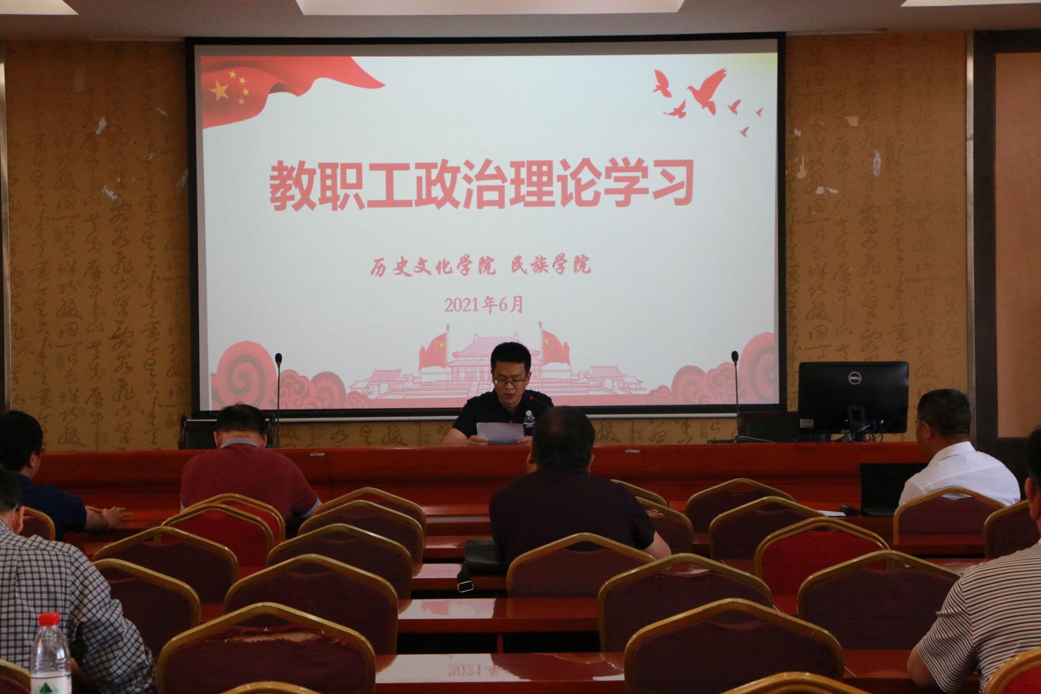 2021年6月4日下午,历史文化公司党委组织全院教职工在荟文楼7楼报告厅进行2021年第六次政治理论学习。此次大会的主要内容是传达公司近期工作会议精神,汇报公司目前主要工作开展情况,并开展政治理论学习。会议由公司党委书记罗庆昌主持。