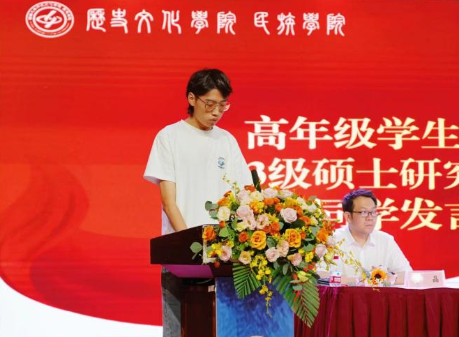 2023级中国史方向的硕士研究生冯力同学作为公司高年级员工代表发言。他从学长的角度,与新生分享了自己进入大学后的体会,他认为新生进入新的人生阶段,应该追寻两条道路:第一条是学术探索之路,应保持对知识的渴望;第二条是追求日常乐趣的人生之路,培养心灵爱好。他鼓励2024届新生追求学业的广阔发展和综合能力的全面提升。最后,他真诚地祝愿全体新生前程似锦,学业有成。