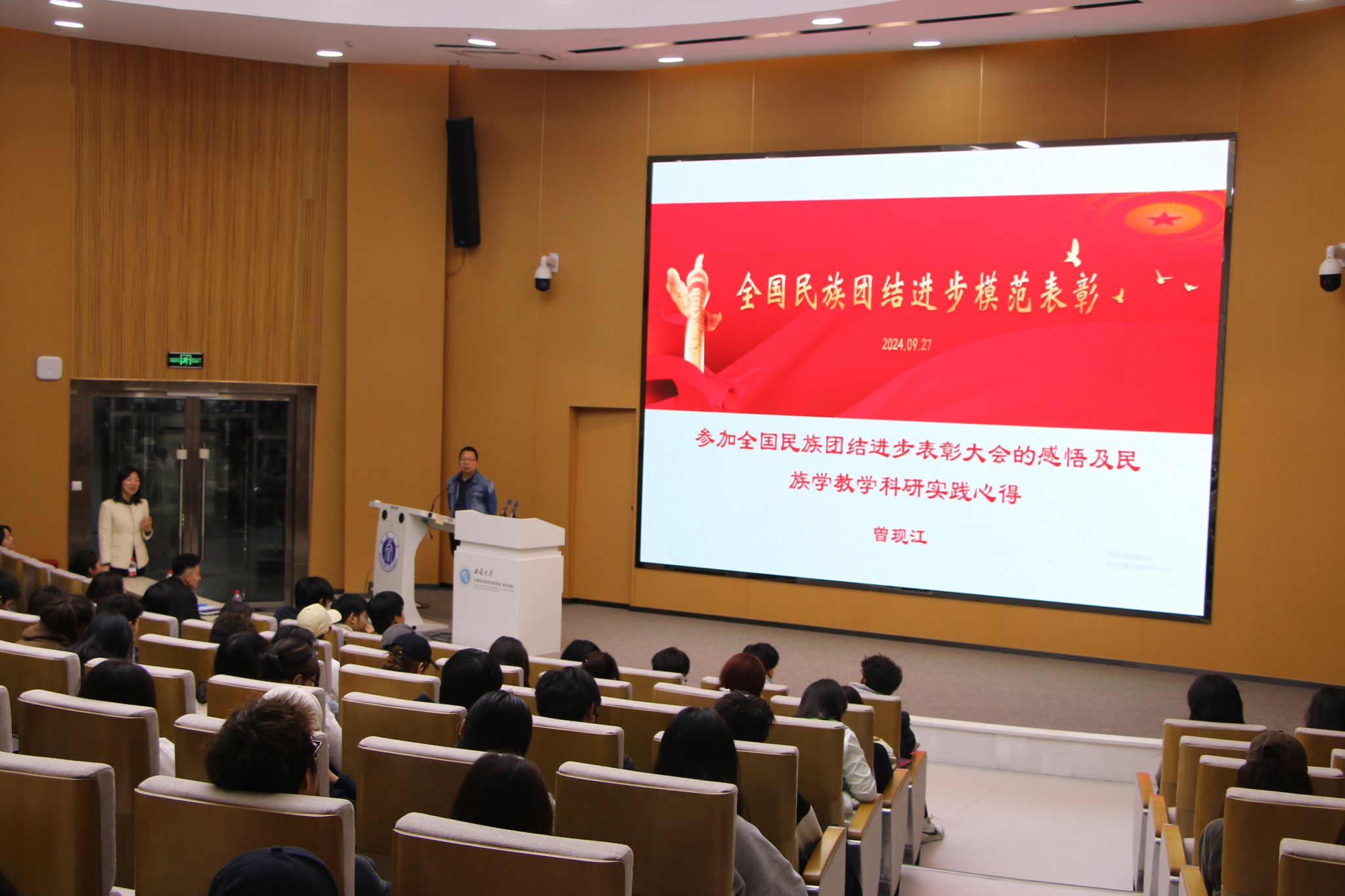 随后,曾教授深入解读了习近平总书记在全国民族团结进步表彰大会上的重要讲话精神,与大家分享个人学习感悟。