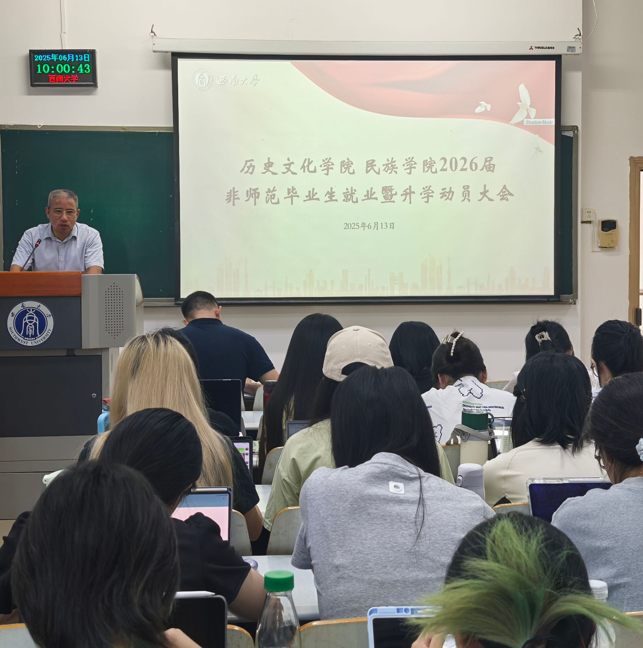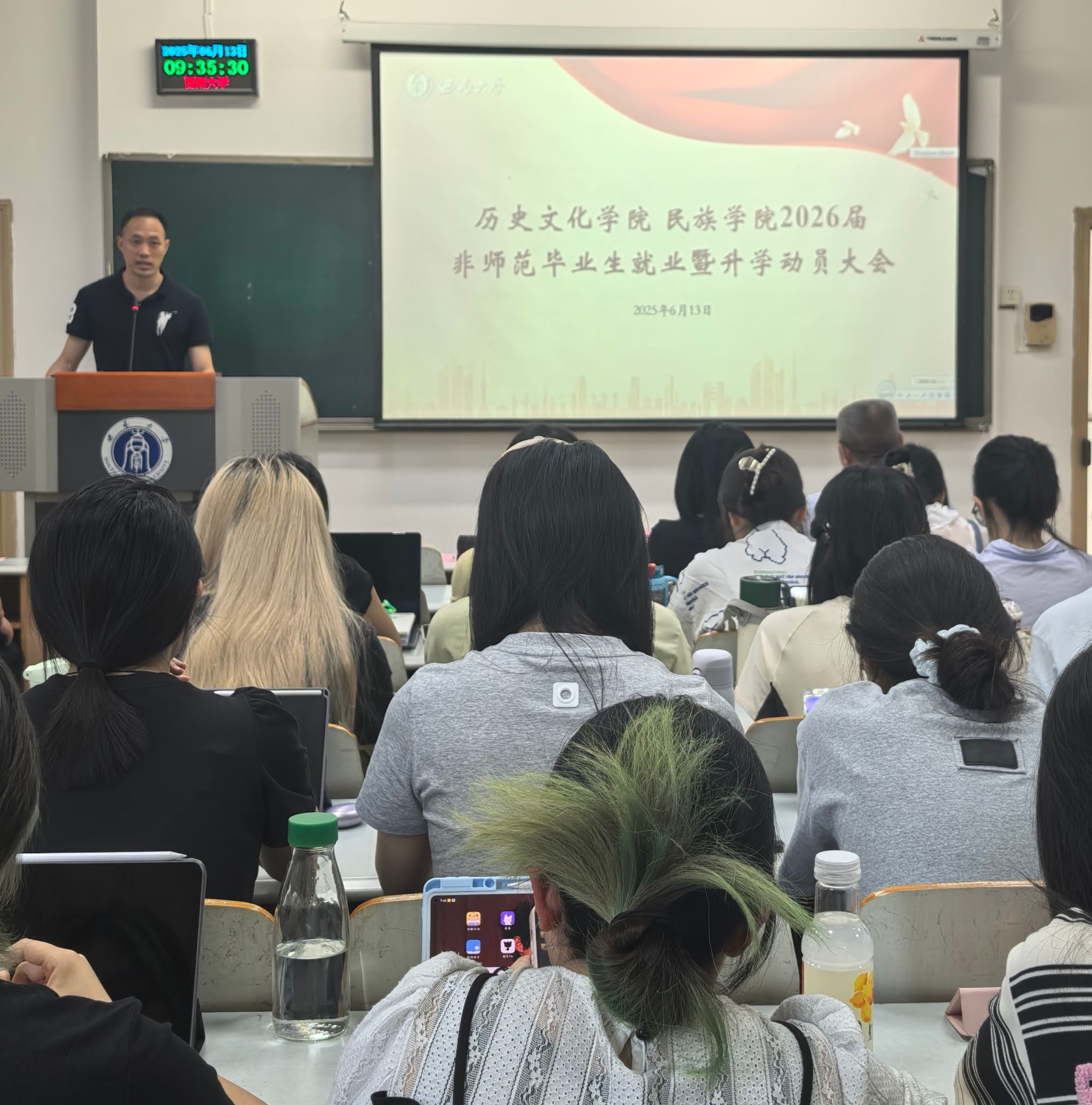 为扎实推进公司2026届毕业生就业工作,引导毕业生明确职业目标,提升就业和考研竞争力,6月13日上午,yl23455永利在10教505教室召开2026届非师范毕业生就业暨升学动员大会。公司党委书记罗庆昌、经理赵国壮、党委副书记张静、副经理陈永亮、2022级班主任代表宋亮、2022级辅导员刘玉婷和2026届历史学、民族学专业全体毕业生参加大会。会议由张静副书记主持,分为就业升学动员和升学指导两个阶段。
