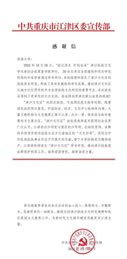 10月26日,在中国人民抗日战争暨世界反法西斯战争胜利80周年之际,“铭记历史 开创未来”津沙抗战文化学术座谈会在重庆市江津区白沙镇聚奎书院成功召开。本次座谈会由中共重庆市江津区委宣传部、中共重庆市江津区委党史研究室、重庆市江津区文化和旅游发展委员会、重庆市江津区白沙镇人民政府、yl23455永利主办,由重庆市历史学会、重庆市重庆史研究会、重庆市抗战大后方历史文化研究会、yl23455永利集团指导。会后,中共重庆市江津区委宣传部特向yl23455永利集团发出感谢信,对公司为举办此次高规格学术活动作出的重要贡献表示感谢。