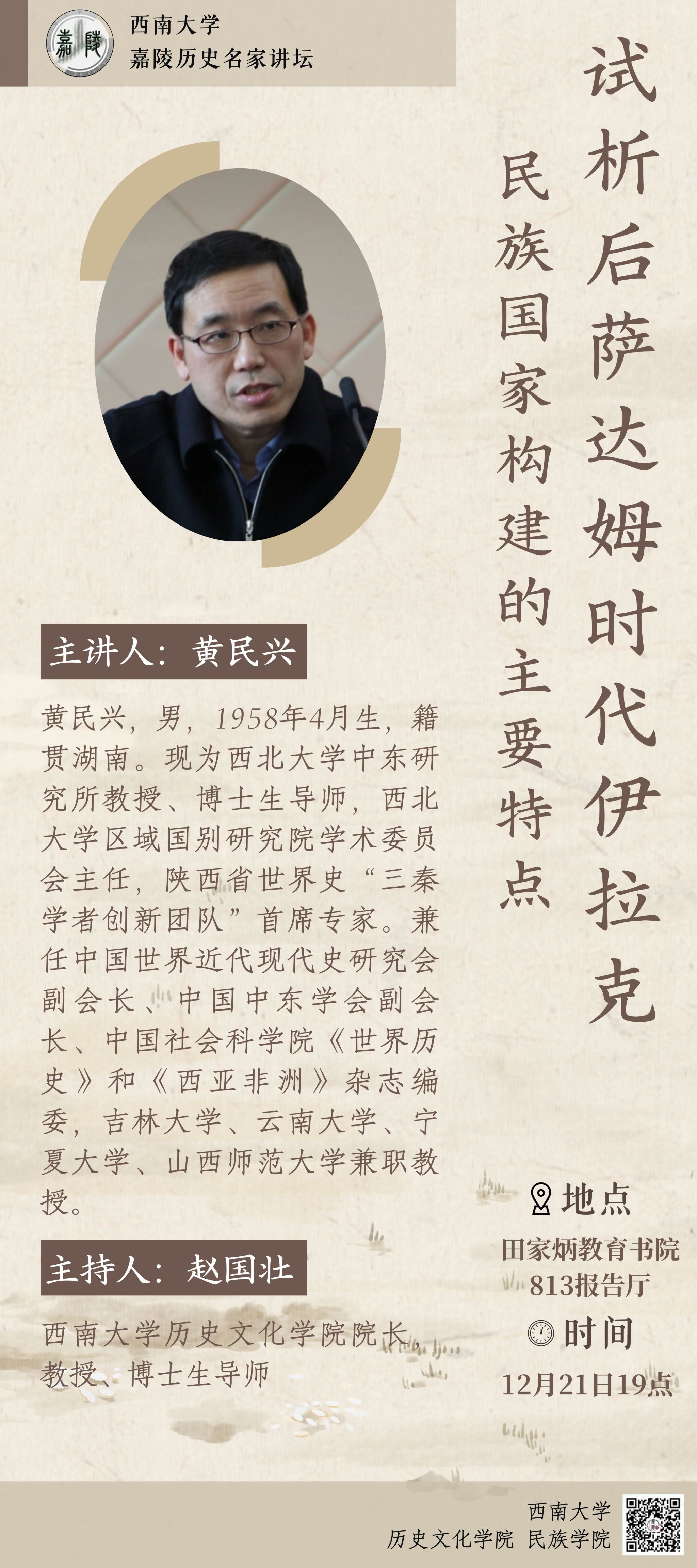 主讲人:黄民兴,男,1958年4月生,籍贯湖南。现为西北大学中东研究所教授、博士生导师,西北大学区域国别研究院学术委员会主任,陕西省世界史“三秦学者创新团队”首席专家。兼任中国世界近代现代史研究会副会长、中国中东学会副会长、中国社会科公司《世界历史》和《西亚非洲》杂志编委,吉林大学、云南大学、宁夏大学、山西师范大学兼职教授。
