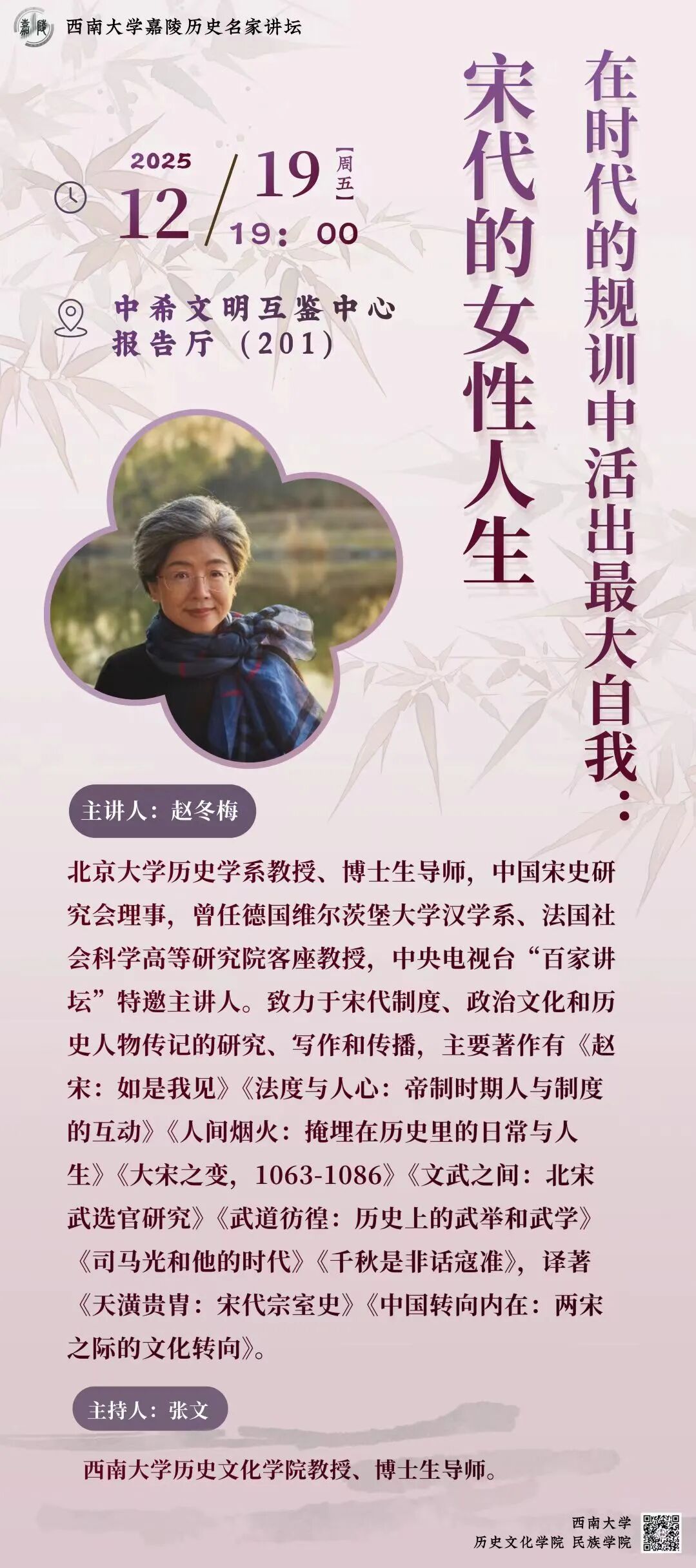 主讲人:赵冬梅,北京大学历史学系教授、博士生导师,中国宋史研究会理事,曾任德国维尔茨堡大学汉学系、法国社会科学高等研究院客座教授,中央电视台“百家讲坛”特邀主持人。致力于宋代制度、政治文化和历史人物传记的研究、写作和传播,主要著作有《赵宋:如是我见》《法度与人心:帝制时期人与制度的互动》《人间烟火:掩埋在历史里的日常与人生》《大宋之变,1063-1086》《文武之间:北宋武选官研究》《武道彷徨:历史上的武举和武学》《司马光和他的时代》《千秋是非话寇准》,译著《天潢贵胄:宋代宗室史》《中国转向内在:两宋之际的文化转向》。